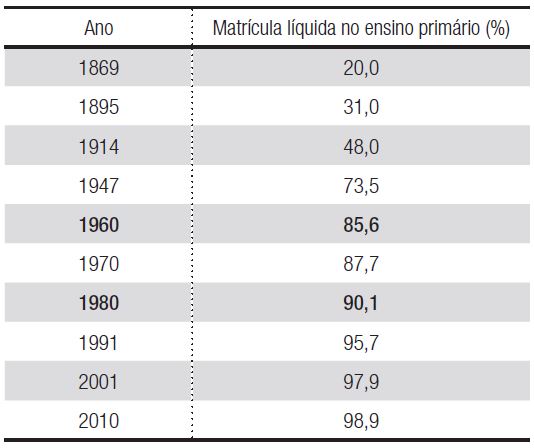 – Argentina – Evolução da taxa líquida de matrícula no ensino primário (1869-2010).