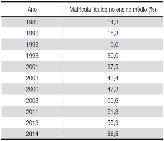 Algo similar se passa nos dois países com relação à escolarização no chamado nível secundário, normalmente cursado por adolescentes com idade entre 13 e 17 anos na Argentina e 15 e 17 anos no Brasil. Como mostra a Tabela 5, a taxa líquida de matrículas nesse nível de ensino na Argentina chega a quase 60% no início da década de 1990, superando 80% em 2010. Enquanto isso, no Brasil, como mostra a Tabela 6, a taxa ainda estava abaixo de 60% em 2014, último ano para o qual os dados estão disponíveis.