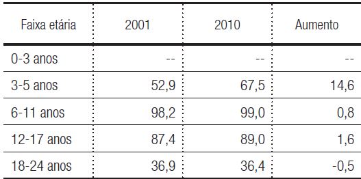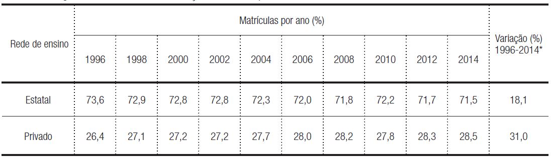 Com isso, embora tenha havido um crescimento nas matrículas nas duas redes, pública e privada, entre meados dos anos 1990 e 2010, ele é maior no setor privado, que cresceu 31% no período em contraposição a 18% do setor estatal, como mostra a Tabela 9.