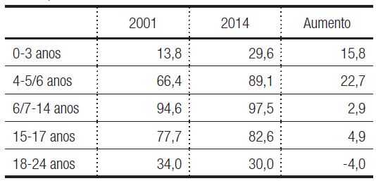 Como se vê ali, nas três etapas da educação básica, a relação entre a faixa de renda familiar e a rede de ensino na qual as crianças e jovens estudam é clara: os indivíduos com renda familiar mais baixa estão predominantemente nas escolas públicas. A escola privada torna-se dominante apenas no quinto quintil. Além disso, na educação básica, a escola pública cresce de importância em todos os quintis entre 2007 e 2014, com a exceção do primeiro quintil no ensino fundamental e médio, nos quais sua importância permanece igual, ainda que em níveis muito baixos.