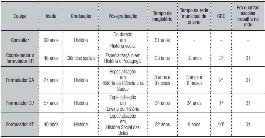 No período em que as entrevistas foram feitas, a equipe dos formuladores dos Cadernos pedagógicos de história contava com cinco pessoas: o consultor, o coordenador, que também era o formulador do Caderno pedagógico de história do 6º ano, e os outros três formuladores, do 7º, 8º e 9º anos, que são professores regentes. Todos os entrevistados afirmaram que o convite para esse trabalho surgiu a partir do reconhecimento e consideração da qualidade de suas práticas pedagógicas.