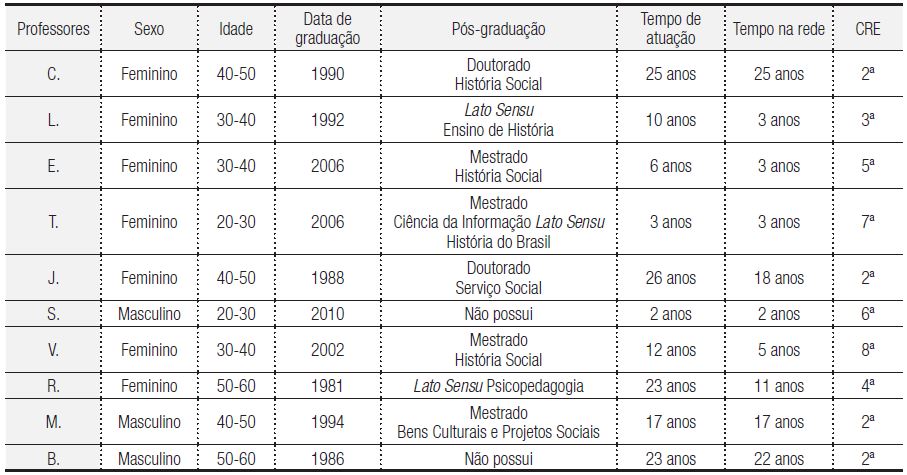 Os entrevistados eram de diferentes faixas etárias. A experiência profissional e o tempo de atuação na rede também variavam. Oito entre dez professores entrevistados possuíam cursos de pós-graduação. Outro dado fundamental para a análise foi a diversidade de coordenadorias às quais pertenciam. Apenas quatro docentes estavam lotados na 2ª CRE. Desses, três foram entrevistados no período fora da greve, seguindo o cronograma inicial da pesquisa. Entre os professores entrevistados durante a greve, apenas um era dessa coordenadoria. Como as escolas permaneceram fechadas durante a paralisação, foi necessário buscar docentes que aderiram ao movimento e realizar mudanças no cronograma e na metodologia da pesquisa.7
