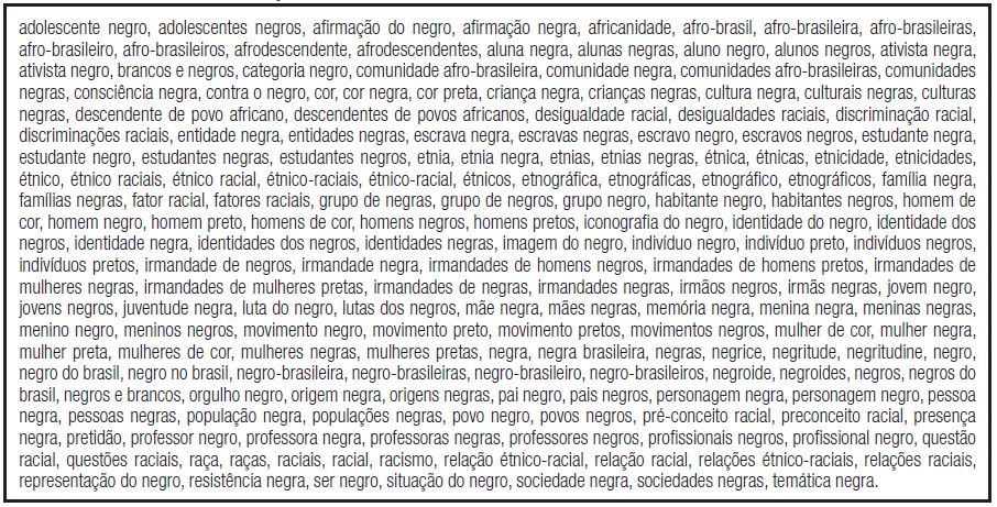 Nesta pesquisa, ao todo, foram definidos 191 descritores (i.e., palavras-chave ou atributos) que foram considerados para procurar teses e dissertações relacionados com a temática de relações raciais. Um descritor é um atributo utilizado para caracterizar um trabalho baseado nas informações registradas no título da dissertação ou tese, resumo, palavras-chave, área de conhecimento, áreas afins e linha(s) de pesquisa.