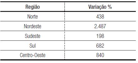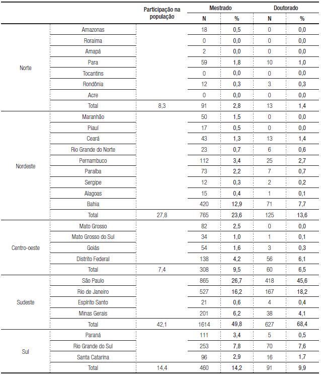 A Tabela 1 apresenta informações sobre o crescimento de titulados por região. Apesar dos esforços de agências governamentais em descentralizar os programas, as taxas de crescimento do Nordeste correspondem a apenas 12,3% dos programas e cursos de pós-graduação em 2008, apesar de uma taxa de variação no período (1996 a 2008) maior do que 2.000%.