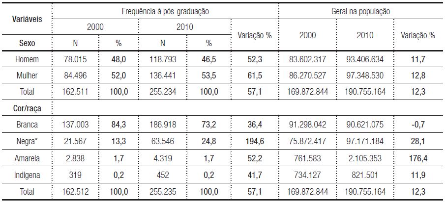 A comparação dos resultados com o geral na população permite avaliar se as alterações nos grupos se devem a fatores demográficos ou se são resultado de mudanças no perfil dos alunos. Enquanto a população brasileira cresceu 12,3%, o número de alunos na pós-graduação apresentou um aumento de 57,1%.