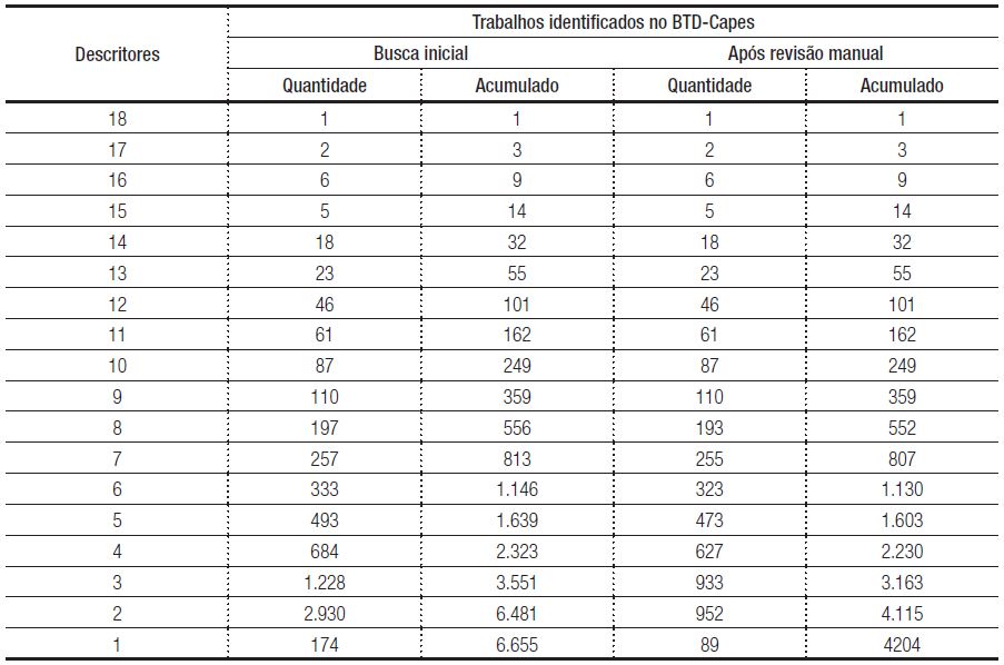 O novo conjunto de registros totalizou, após a filtragem dos “falsos positivos”, um universo de 4.204 trabalhos, que constituiu o corpus final de estudo. A totalização por número de descritores é apresentada na Tabela 3.