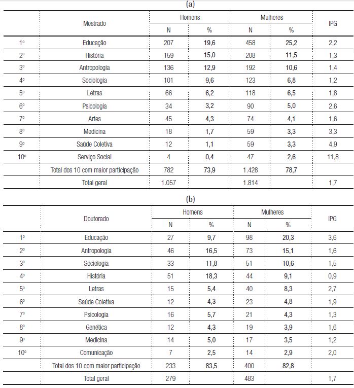 Nas análises pelo IPG, nas dez áreas de maior participação da temática das relações raciais, as mulheres predominam, com exceção da área de história (no doutorado), com maior presença de homens autores (IPG 0,9).