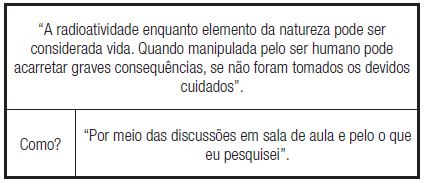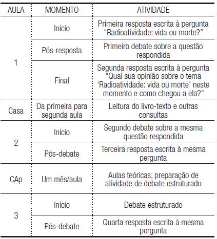 A atividade, planejada antecipadamente, alternava uma produção escrita individual de tema “Radioatividade: vida ou morte?” e debates em grupo sobre essa questão. A primeira resposta a essa pergunta inaugurou as aulas sobre a temática, sendo, portanto, realizada antes de qualquer conteúdo sobre esse tema ter sido trabalhado em sala de aula. Ao todo foram quatro escritas intercaladas com três debates. Cada um dos debates aconteceu em um momento diferente do trabalho sobre a temática, tendo o primeiro ocorrido logo após a primeira escrita. Em seguida, realizou-se a primeira discussão em grupo sobre a temática, à qual se seguiu uma nova resposta escrita. O segundo debate foi realizado na aula posterior, depois de os alunos serem instruídos a lerem o livro-texto e a buscarem outras fontes sobre o tema “Radioatividade” em casa. Também a esse debate seguiu-se nova resposta escrita. O terceiro debate aconteceu depois de um mês de aula e teve uma estrutura prévia combinada com os alunos: a composição de três grupos, sendo um proponente de um projeto envolvendo radioatividade; outro composto por um “júri popular”; e o outro composto pelo “governo”. Esses dois últimos tinham a função de avaliar e julgar a pertinência da proposta do primeiro. A última resposta escrita foi realizada após essa atividade. Um resumo desse procedimento metodológico pode ser visto no quadro abaixo: