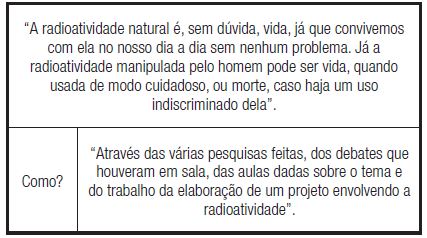 É válido lembrar que, antes do debate, Ana havia estabilizado sua posição (“Acho que radioatividade é mais morte do que vida, pois os perigos causados por ela não podem ser evitados facilmente, de forma que o prejuízo é maior do que o benefício”). Assim, é interessante perceber que a sua presença nas discussões em sala de aula fez Ana desestabilizar seu posicionamento. Um detalhe bastante importante de seu segundo texto se refere ao fato de ela ter dito que ouviu muitas observações diferentes e válidas que a deixaram confusa. No entanto, quando se espera que ela traga posições contrárias à sua posição anterior que justifiquem a confusão que agora a invade, ela traz mais justificativas voltadas à sua primeira posição, isto é, voltadas para os malefícios da radioatividade: “o problema da radioatividade é muito grave e, ao mesmo tempo, necessário”; “não sabemos exatamente os resultados das aplicações que a radioatividade tem em nossas vidas”; “os problemas causados pela radioatividade no campo físico-químico interferem bastante no âmbito político e social, pois a possibilidade de haver (supostamente) uma guerra nuclear causa, paradoxalmente, outras guerras”.