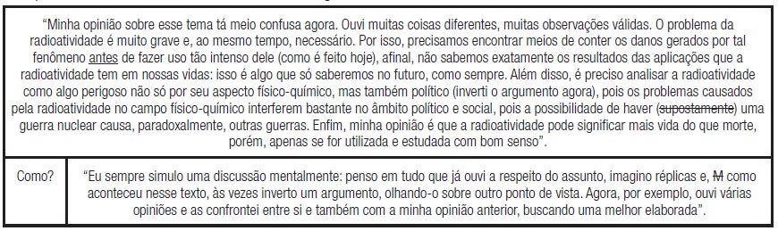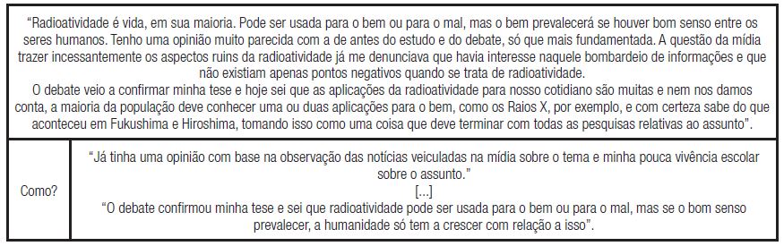 Na construção organizada por Edson no segundo parágrafo, pode-se observar a concepção intuitiva que ele tinha antes de estudar o assunto e que foi confirmada pelo debate (“o debate veio a confirmar minha tese”). Ou seja, o debate lhe deu subsídios para ele argumentar o quanto no discurso da mídia prevalecem os possíveis aspectos maléficos da radioatividade, sendo concedido pouco espaço aos benefícios – que, para ele, são muitos e dos quais acabamos não nos dando conta (“a maioria da população deve conhecer uma ou duas aplicações para o bem, como o Raio X, por exemplo, e com certeza sabe do que aconteceu em Fukushima e Hiroshima”). Vemos, ainda, na sua resposta ao “como”, que o debate confirmou sua tese, o que nos indica a relação dos movimentos de reflexividade do pensamento com a situação de argumentação oportunizada pela atividade.