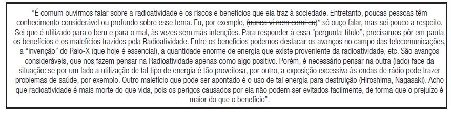A aluna constrói ainda um argumento a partir de um ponto de vista que se inicia por um indicador modal (“precisamos”), o que sinaliza a importância daquilo que será dito (KOCH, 2000): “precisamos encontrar meios de conter os danos causados por tal fenômeno antes de fazer uso tão intenso dele”. Após esse ponto de vista, Ana traz o operador argumentativo “afinal” – que, segundo Koch (2000), funciona como introdutor de uma justificativa relativa a um enunciado anterior – para apresentar sua fundamentação: “afinal, não sabemos exatamente os resultados das aplicações que a radioatividade tem em nossas vidas”. Como apontamos acima, toda essa construção não a ajuda a justificar sua confusão atual, uma vez que claramente a mesma está, até aqui, a serviço de seu argumento inicial.