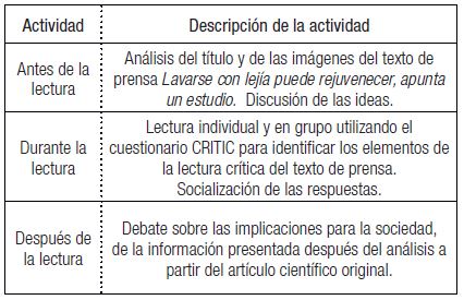 Se diseñó una secuencia de actividades estructuradas según las tres fases del proceso lector (antes, durante y después de la lectura). La fase previa consistía en interpretar el título y las imágenes de la noticia y anticipar el posible contenido de la misma. Durante la lectura, a través de cuestionario CRITIC (cuadro 4) se analizaron diferentes aspectos de la noticia, como el contenido científico y el método de investigación presentado. En la fase posterior a la lectura se comparó el texto periodístico con el artículo original a partir del cual se había escrito la noticia y se interpretaron sus posibles implicaciones sociales (Cuadro 1).