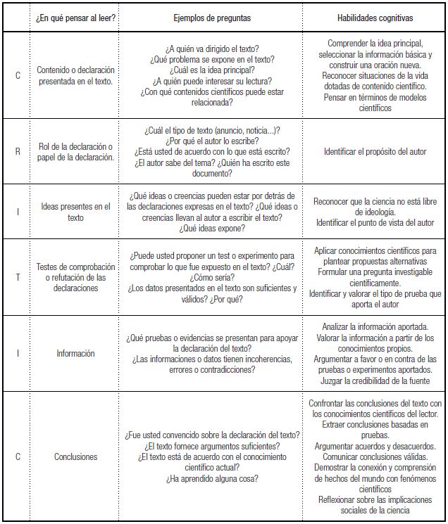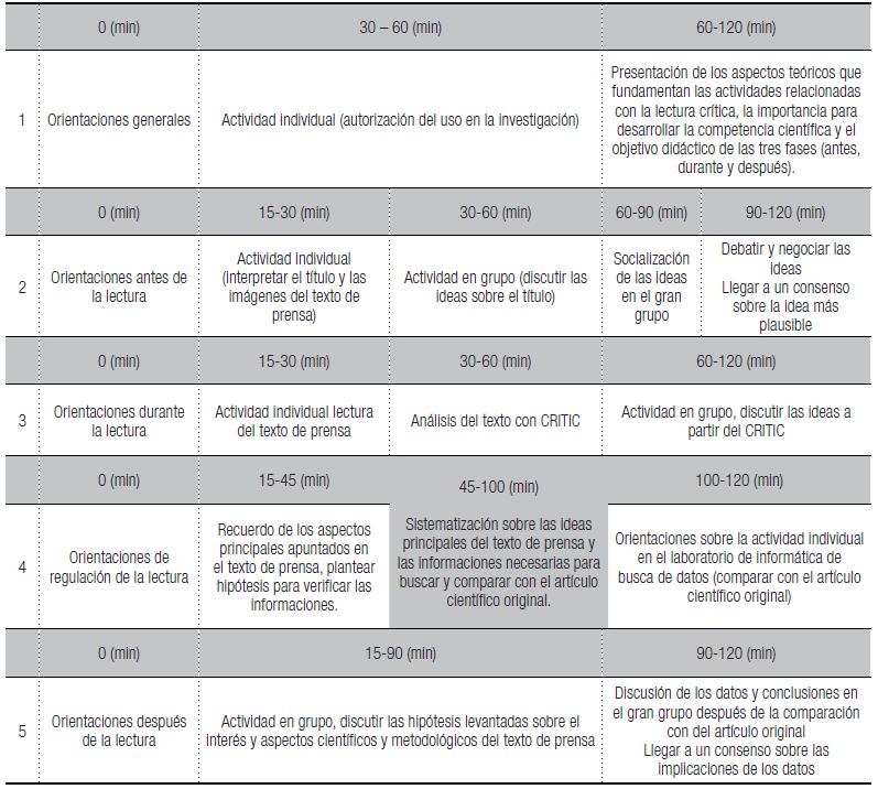 En términos didácticos, las actividades son desarrolladas en tres fases (SOLÉ, 1998): antes, durante y después de la lectura. Antes de la lectura, se activan las ideas previas y se formulan las hipótesis iniciales; durante la lectura, se regula el proceso de comprensión del texto y análisis crítico del mismo; después de la lectura se evalúa el proceso. Desde esta perspectiva, se revela la importancia de proporcionar en el aula un ambiente de discusión y análisis del problema presentado en el texto, primero individualmente y después socializando y negociando sus ideas en el grupo pequeño y, posteriormente en el gran grupo. Para acompañar y orientar en el desarrollo de la lectura crítica se propone un instrumento orientador (CRITIC) apoyado en los estudios de Bartz (2002) y de Paul y Elder (2005).