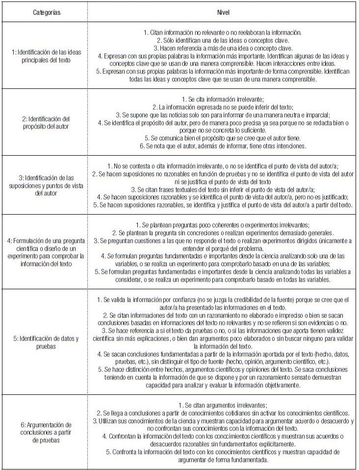 Para analizar los datos se han definido una rúbrica con seis categorías, que corresponden a los elementos de lectura crítica de textos con contenido científico y se determinaron sus porcentajes. En cada categoría se utilizaron cinco niveles de argumentos (cuadro 5).