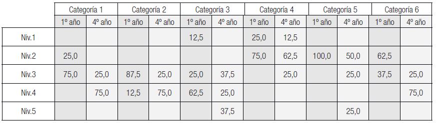Las respuestas y las transcripciones se organizaron en tablas y se analizaron en función de las categorías expresas en el cuadro 5 en un proceso inductivo-deductivo. Cada unidad de significado fue asignada a una categoría y a un nivel (elaboradas a priori) y se identificaron sus porcentajes (BARDÍN, 1986; OLIVERAS; MÁRQUEZ; SANMARTÍ, 2014).