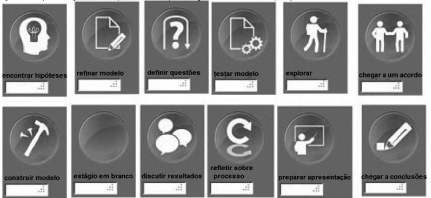 A principal característica dessa ferramenta é o uso de ícones e conectores para criar um plano metacognitivo que representa colaborações a ser seguidas durante a resolução de problemas em grupo. Os ícones representam diferentes etapas e processos pertencentes à aprendizagem baseada na investigação e resolução de problemas, tais como a experimentação, a construção de modelos, a elaboração de hipóteses, e também atitudes tomadas em prol do trabalho em grupo, como ser crítico e estar aberto. Algumas etapas de atividades da ferramenta de planejamento são mostradas na figura 1.