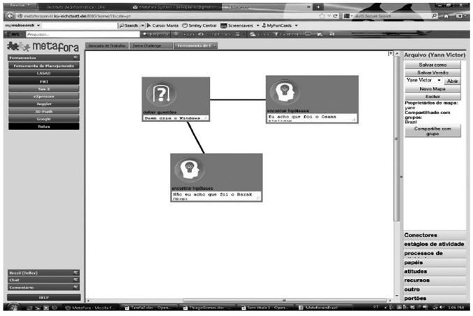 Infelizmente, as interações dos estudantes não foram registradas durante as atividades de laboratório. Este estudo de caso foi limitado a observações dos professores dessas interações e às informações contidas nos mapas criados e registrados na ferramenta de planejamento da Metafora. Assim, não foi possível efetuar uma análise mais profunda do desenvolvimento de L2L2. No entanto, este estudo de caso vai ao encontro de resultados de outros estudos de casos realizados no Reino Unido, Espanha, Israel e China ( YANG; WEGERIF; GWERNAN--JONES, 2012).