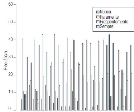 Como mostrado na figura 14, as respostas às perguntas 4, 6, 9, 13 e 21 indicam que os alunos se sentiram motivados a trabalhar em grupo ao usarem a ferramenta de planejamento Metafora. Noventa e sete por cento responderam positivamente à questão 19 ( figura 14), o que indica que os alunos tiveram prazer na superação de desafios.