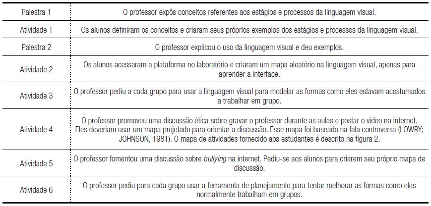 Trabalhamos com duas classes do sexto ano escolar: o sexto ano A e o sexto ano B. Os alunos estavam na faixa de 10 a 12 anos. Eles foram escolhidos porque o sistema Metafora foi concebido preferencialmente para estudantes nessa faixa etária. Havia cerca de trinta alunos por classe. Nós os dividimos em grupos de cinco. Cada classe tem duas aulas (de cinquenta minutos cada) por semana. O estudo de caso teve a duração de catorze aulas. Os alunos realizaram seis atividades durante doze aulas e assistiram a duas palestras. O pesquisador elaborou todas as atividades; no entanto, o professor participou ativamente de todas elas. As atividades e palestras estão descritas na tabela 1.