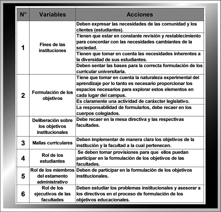 A su turno, un par de años antes Faulkner (1958) había realizado un análisis sobre la formulación de los objetivos organizacionales de las universidades. Si bien no hace mención explícita al término de gobernanza universitaria, deja claro cuáles son los elementos sobre los que se edifican las políticas de las universidades y por ende de los que la gobernanza universitaria debe hacerse cargo; destacando las siguientes variables: