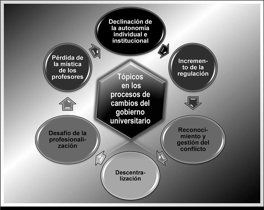 Desafiadas perennemente por su contexto, las organizaciones universitarias se fueron tornando en enrevesadas, a medida que transcurren los años y surge de manera natural la necesidad y el imperativo de buscar fórmulas innovadoras para administrarlas debidamente. Es factible afirmar, que espontáneamente se evolucionó hacia la búsqueda de métodos de gobernanza que proporcionaran mayores niveles de eficiencia, eficacia y efectividad organizacional. Baldridge (1973), complementa con mucha nitidez y lucidez lo expresado en forma a priori, afirmando que mientras más grande es la institución universitaria, mayores son los niveles de libertad en la labor de los académicos y por ende la institución será más difícil y engorrosa de administrar; si a esto se le adicionan las nuevas tareas y funciones que va asumiendo la universidad, la labor se transforma en algo aún más agobiante y desafiante. Es entonces que la exploración interna del gobierno, de la planificación (operativa y estratégica), de la morfología organizacional, de los procesos, de la gestión y de las políticas universitarias, se convierte en un fenómeno atractivo (desde la perspectiva investigativa teórica y empírica), estudiable y analizable; claramente comparable con aquellos que se encuentran en sistemas de gobiernos nacionales o locales (MOODIE; EUSTACE, 1971; MASON, 1978).