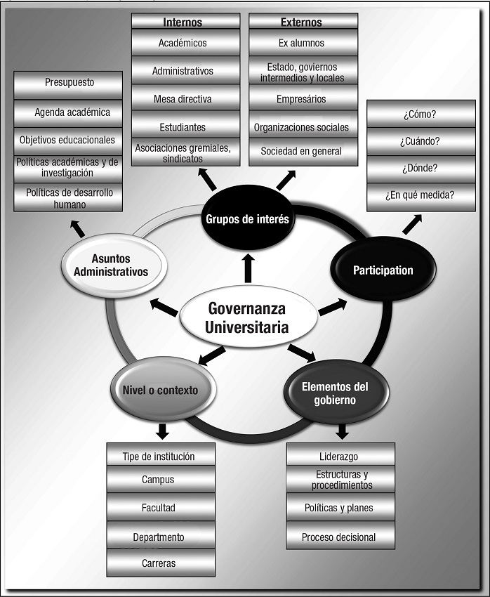 En este ámbito analítico, podría afirmarse que en el periodo estudiado se logran identificar cinco elementos a saber: en primera término, se distinguen los elementos de gobierno (liderazgo, estructuras y procedimientos, políticas y planes, proceso decisional); luego está el denominado nivel o contexto (tipo de institución, campus, facultad, departamento, escuelas, carreras); también tenemos los llamados asuntos administrativos (presupuesto, agenda académica, objetivos educacionales, políticas académicas y de investigación, políticas de desarrollo humano.); adicionalmente está la participación (¿cómo? ¿cuándo? ¿dónde? ¿en qué medida?); se ha dejado para el final, a los grupos de interés, distinguiendo entre internos y externos, dado que con un propósito eminentemente didáctico, se reconocen como tales a los segundos, a partir de la década de los ochenta, todo lo cual está debidamente respaldado en la literatura especializada, con trabajos de autores como: Wandira (1981); Baldridge (1982); Grant (1983); Clarice; Hough; Stewart (1984); Drummond, y Reitsch (1995); Ehara (1998); Pierson (1998); Gornitzka (1999); Eckel (2000); Hill, Green y Eckel (2001); Longin (2002); Trakman (2008); Mok (2010); Krücken (2011); Chan y Richardson (2012); Kretek, Dragsic; Kehm (2013); Schick, Novak (1992); Greenhalgh (2015); Filippakou y Tapper (2015); por citar algunos de los más relevantes.