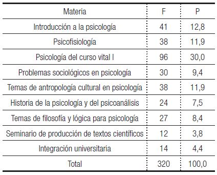 En este trabajo combinamos los enfoques cuantitativo y cualitativo de investigación ( HERNÁNDEZ SAMPIERI; FERNÁNDEZ COLLADO; BAPTISTA LUCIO, 2006). Analizamos los textos que corresponden al material bibliográfico de las nueve materias del primer año de la citada carrera. Tres de estas materias son anuales ( Introducción a la psicología, Psicofisiología y Psicología del curso vital I); cuatro son cuatrimestrales ( Problemas sociológicos en psicología, Temas de antropología cultural en psicología, Temas de filosofía y lógica en psicología, Historia de la psicología) y dos son entre bi y trimestrales ( Integración universitaria y seminario-taller: producción de textos científicos). El corpus estuvo compuesto por 320 textos. En la tabla que sigue sintetizamos la composición del mismo.