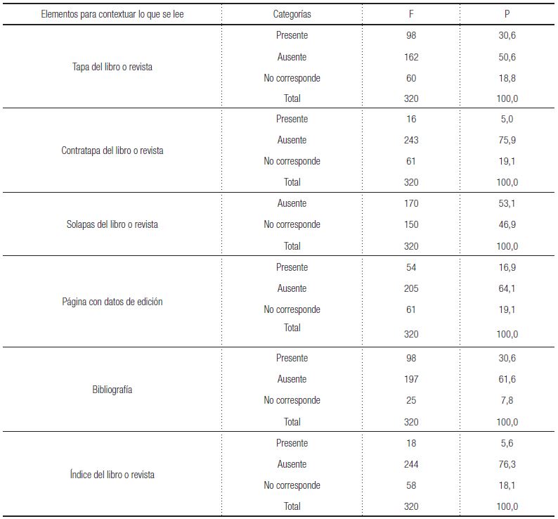 Como se muestra en la Tabla 1, analizamos si el material bibliográfico de todas las materias tenía elementos que ayudaran al lector a contextuarlo. En general, la tapa, contratapa, solapas, página con datos de edición, índice, bibliografía se encuentran ausentes.