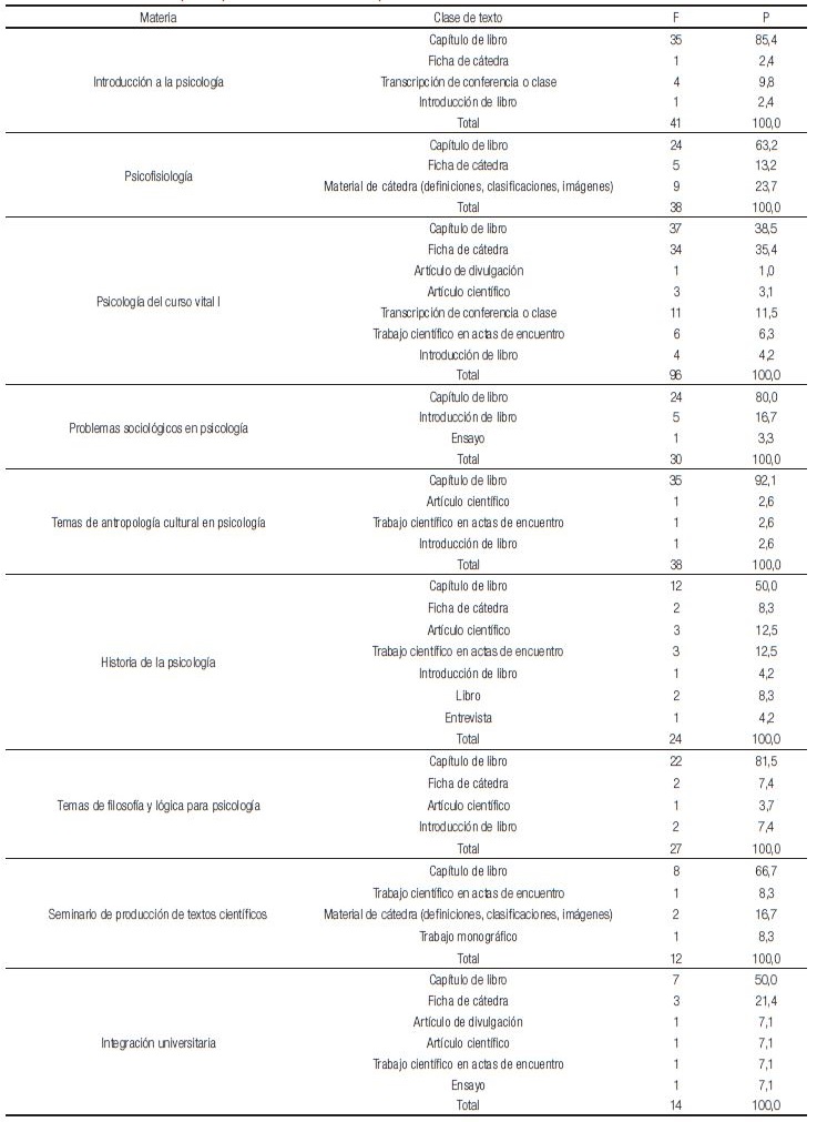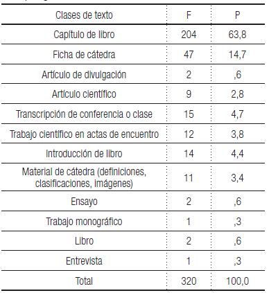 Además, buscamos analizar las clases de textos utilizados en las diferentes materias, lo cual puede verse en la Tabla 3.