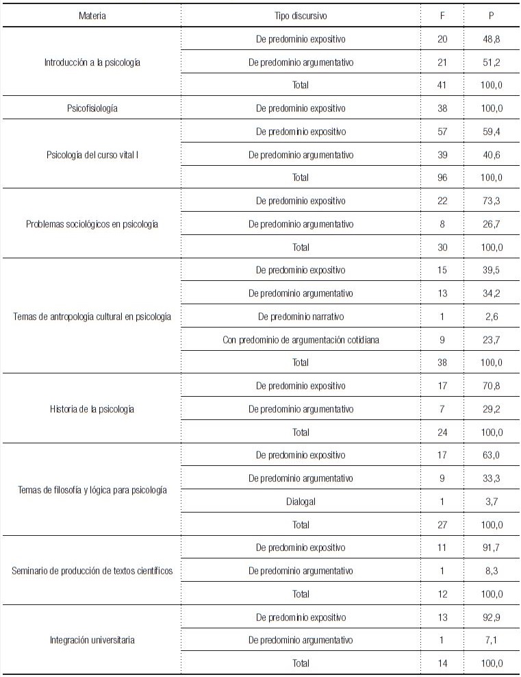 Con base en las categorías analíticas de Padilla, Douglas y López (2007; 2011), se encontró que en materias como Integración universitaria, Psicofisiología, Psicología del curso vital I, Problemas sociológicos en psicología y Temas de antropología cultural en psicología abundan los textos de predominio expositivo, y en Introducción a la psicología, los de predominio argumentativo. Siguiendo a Padilla, Douglas y López (2011) también, apreciamos la presencia de textos en los que predomina la argumentación cotidiana en una materia — Temas de antropología cultural en psicología—. Teniendo en cuenta los planteos de Kaufman y Rodríguez (1993) encontramos la presencia de textos conversacionales en Temas de filosofía y Lógica para psicología.