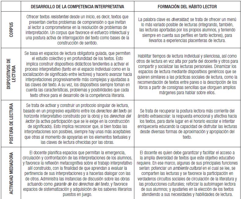 Sin duda, lo anterior ha ayudado en el proceso de concreción de los principales desafíos que enfrenta la educación literaria. No obstante, ha sido necesario concretar aún más la programación considerando los objetivos específicos que guían la actuación educativa. En ese marco, es importante recordar que, si bien los objetivos de desarrollo de la competencia interpretativa y de construcción del hábito lector son complementarios y deben planificarse en conjunto, ambos necesitan de estrategias diferenciadas y comportan diferentes modalidades de lectura: una lectura analítica y guiada, en el primer caso, y una lectura autónoma, en el segundo. A su vez, ambas modalidades están relacionadas con una determinada intencionalidad: “la voluntad de analizar y de estudiar los textos en profundidad, por una parte, o bien la de trasladar a la escuela los rituales de las prácticas privadas y sociales de lectura, por otra” (MANRESA, 2013, p. 62). Asimismo, cada una de estas dimensiones tiene su propio espacio de desarrollo: mientras la lectura por placer y la construcción del hábito encuentran en la biblioteca (escolar o de aula) su medioambiente más natural, la competencia interpretativa se adquiere fundamentalmente en el contexto de la clase de lengua y literatura (MARGALLO, 2012).