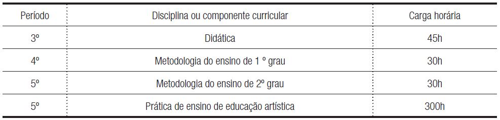 A formação em didática se desenvolve através de três disciplinas e da prática de ensino. Referimo-nos à didática (disciplina que corresponde à didática geral), metodologia do ensino de 1º grau, metodologia do ensino de 2º grau e prática de ensino em educação artística. O curso, criado na década de 1970, passou pela última reforma curricular nos anos de 1980. Sua proposta oficial oferece habilitação em artes plásticas e desenho e se assenta em uma perspectiva de ensino fundada nos parâmetros tecnicistas. O curso é oferecido pela Escola de Belas Artes, ficando a formação pedagógica sob a responsabilidade da Faculdade de Educação, cujos docentes que atuam no curso experimentam cotidianamente a tensão entre um currículo oficial assentado em uma perspectiva e a própria prática curricular contrapondo-se àquela, conforme depreendemos através de pesquisa anterior, voltada para os professores formadores. Sobre a carga horária e a periodização do ensino de didática no currículo do curso, o quadro a seguir sumariza estas informações.