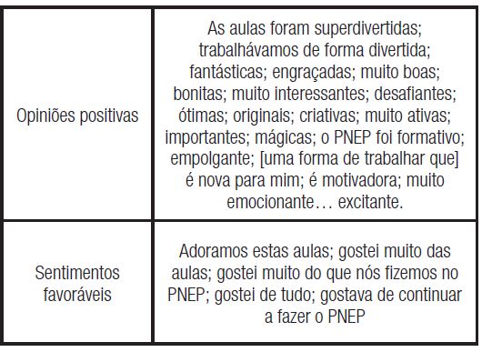 A resposta à pergunta sobre opiniões e sentimentos construídos sobre as aulas foi surpreendente: as crianças gostaram muito do PNEP. Associaram felicidade, gosto e prazer à sua experiência, expressando opiniões muito positivas e sentimentos muito favoráveis e fortes: