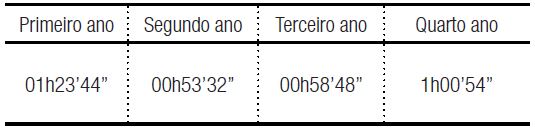 Realizei a análise formal e de conteúdo com um colaborador e com um avaliador voluntário, professor de primeiro ciclo. A triangulação dessa análise formal com a análise de conteúdo permitiu a identificação final de dezenove entrevistas como sendo maximamente relevantes para transcrição. Esse procedimento permitiu a identificação de cinco entrevistas por ano de escolaridade, exceto o terceiro ano, com quatro entrevistas. O tempo total de transcrição distribui-se do seguinte modo: