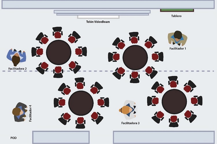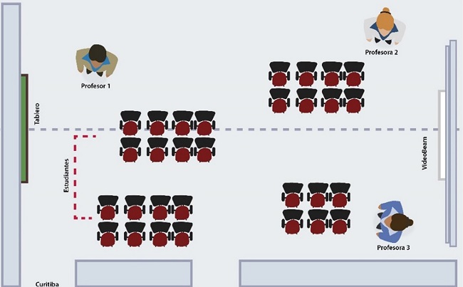 Una investigación hasta ahora no publicada por los autores identificó algunos elementos importantes en perspectiva de generar procesos formativos de calidad en posgrados de administración y afines. Es así como a partir de observar una serie de clases en Curitiba y San Francisco (ver figuras 1 y 2) se identificaron salones proyectados para el trabajo en equipo, entre iguales, en colaboración y para desarrollar tareas conjuntas. A diferencia de la disposición de una clase habitual (salones estrechos y con sillas fijas), estos, por su amplio espacio, ubicación de profesores y disposición de sillas y recursos predispone al grupo para el trabajo colaborativo y la interacción.