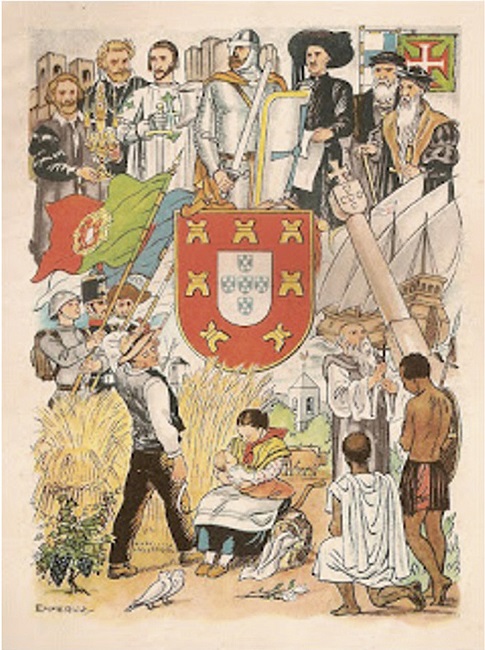 Portugal era visto como un país antiguo lleno de héroes: D. Alfonso Henriques, el primer rey, Nuno Álvares Pereira, un héroe de la independencia de Castilla, Infante D. Henrique, el iniciador de la expansión marítima, Vasco da Gama, el descubridor de la ruta marítima a la India, Alfonso de Albuquerque, valiente virrey en la India y, por supuesto, los líderes de la nación: el Presidente de la República y Salazar (O livro da terceira classe, 1954). Sin embargo, si la incitación patriótica es menos evidente en los libros de primer y segundo curso, no está completamente ausente de ellos. Los ejemplos más significativos se encuentran en los libros de los primeros cursos más aún porque, en cualquier caso, la forma en que se aborda el tema demuestra un claro propósito de impresionar a los niños. En uno, el texto, coronado por una ilustración de niños cantando, insta: «¡Arraial, oh portugueses, / Arraial, arraial, arraial! / Arraial, que está alerta / ¡Quién salvará a Portugal!» (O livro da primeira classe, s/f, p. 48); en otra, una página completa presenta un dibujo muy colorido donde dos niños colocados en la esquina inferior miran respetuosamente un mapa de Portugal que se encuentra sobre sus cabezas. De todos modos, mirando la mayoría de los manuales de lectura que fueron utilizados por los estudiantes que asistieron a los dos primeros cursos, está claro que Portugal, considerado en su totalidad y como una entidad soberana y simbólica, apenas era visible. Los libros de los años siguientes serían mucho más incisivos en esto (O livro da terceira classe, 1954, Livro de leitura para a 4ª classe, s/f).