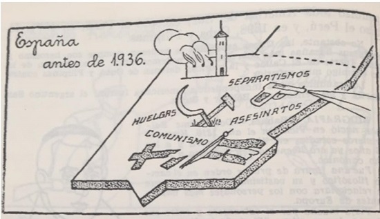 La imagen número 1 pretende transmitir una serie de estereotipos históricos que los golpistas utilizaron para justificar el denominado Alzamiento nacional y que se produjo el 18 de julio de 1936: incendio de iglesias y quema de conventos, asesinatos sin juicio previo predominando la ley del más fuerte, separatismo y quiebra de la unidad nacional, implantación de un régimen comunista y de su simbología, huelgas que llevaban a la deriva a la economía española, etc. Todo ello, habría justificado un Golpe de Estado de la denominada derecha española para restablecer la paz, el orden y la religión católica liderado por el dictador Caudillo Franco considerado héroe salvador como se señala en la imagen número 3.