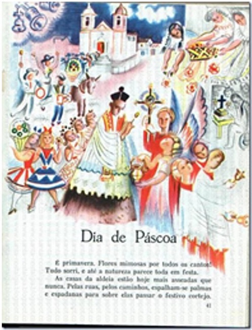 La religión fue uno de los elementos centrales en la configuración de la sociedad que pretendían los regímenes dictatoriales ibéricos. En Portugal, lo que es más evidente en los libros publicados después de los años cuarenta de aquellos similares a los utilizados durante la década de 1930 (PIMENTA; EVANGELISTA, 1933, 1934; VAIRINHO, 1935a, 1935b; CABREIRA; CABRAL, 1932) es el espacio dedicado a la religión. Cada uno de los tres libros tiene docenas de páginas de doctrina católica, que deberían funcionar como un catecismo, además de muchos otros con referencias a aspectos de naturaleza religiosa. En vista del espacio ocupado, no tenemos dudas de que el Estado Novo consideraba la religión católica como un haz estructurante de su ideología, pero queda por ver cómo los diferentes maestros vieron esta parte del catecismo (FERREIRA; BRITO, 2003).