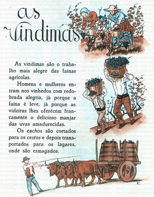En O livro da segunda classe (1958), a través de ilustraciones y textos, se favorece el medio rural, con muchos textos especialmente relacionados con la agricultura, el pastoreo y la silvicultura en lecciones como La cosecha, Los cereales, Los alcornoques, El granjero, El pastor. También en el O livro da terceira classe (1954), adoptado como un libro único a principios de los años cincuenta, la afirmación de privilegiar al mundo rural con un énfasis especial en las actividades agrícolas es bastante evidente. Los pueblos, La vida en el campo, Las mondas, Los rebaños, Los riegos, Los segadores, La casa del granjero, son títulos que muestran esta importancia dada a las zonas rurales (imagen n. 5). Cabe señalar que los aspectos relacionados con la vida urbana apenas aparecen en este libro. Las ciudades fueron ignoradas en gran medida. De estos, se destacan los principales monumentos, que, sin embargo, se presentan por lo que representan para la Historia de la Nación, un tema al que el libro brinda un gran alivio y que lo distingue de los manuales destinados a años anteriores.