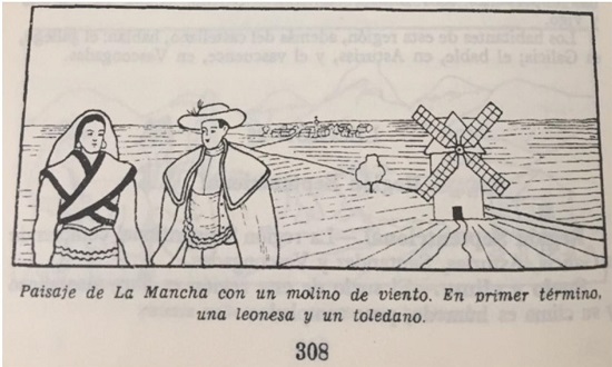 El predominio económico del sector primario (GARCÍA DE CORTÁZAR; GONZÁLEZ, 2009) y la exaltación del mundo agrario frente al urbano tuvo su repercusión en el escaso acceso a la enseñanza secundaria que era elitista y seguía unas pautas marcadas por una fusión entre un catolicismo conservador y un nacionalismo franquista. Quienes estudiaban bachillerato (generalmente su acceso era a los 11 años) sólo utilizaban, como mucho, los dos primeros grados de la enciclopedia. El resto de la población escolar, raramente completaban los tres grados de la enciclopedia o pasaban directamente al mundo laboral en edades muy tempranas. En este sentido, la imagen 6, esquematiza el mundo rural utilizando un símbolo que Cervantes había universalizado en el Quijote, los molinos de viento, acompañado por los trajes regionales de una leonesa y un toledano, símbolos también de una pluralidad regional étnica folklórica.