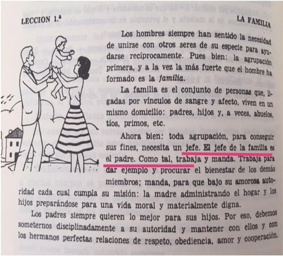 […] toda agrupación, para conseguir sus fines, necesita un jefe. El jefe de la familia es el padre. Como tal, trabaja y manda. Trabaja para dar ejemplo y procurar el bienestar de los demás miembros; manda, para que bajo su amorosa autoridad cada cual cumpla su misión: la madre administrando el hogar y los hijos preparándose para una vida moral y materialmente digna. (1964b, p. 624).