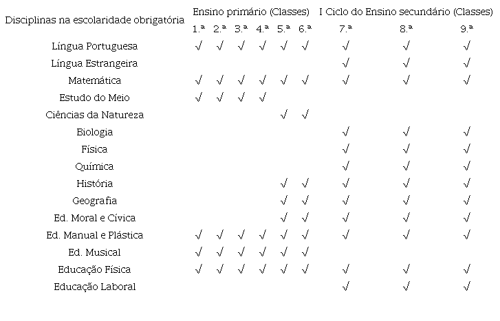 Durante a escolaridade obrigatória as ciências são inicialmente abordadas de modo integrado, em estudo do meio e em ciências da natureza, sendo ensinadas como disciplinas independentes (física, química, biologia) da 7ª à 9ª classe ( Quadro 1 ). É ainda de notar que o Iº ciclo do ensino secundário inclui também a disciplina de educação laboral, a qual procura criar um vínculo entre a educação e o mercado de trabalho (INIDE/MED, 2019). Contudo, a finalidade da educação, e em particular da educação em ciências, durante a escolaridade obrigatória vai além da potencial inserção dos alunos no mercado de trabalho. Procura também formar cidadãos atuantes na sociedade em que vivem ( ANGOLA, 2016 ):