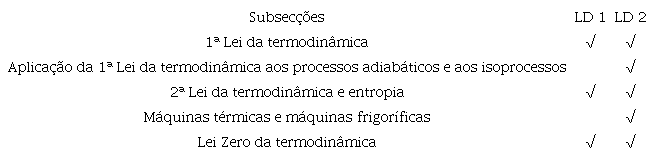 A análise dos textos do capítulo de termodinâmica, a um nível macro, permite constatar que ambos os capítulos são marcados por narrativas com uma linha conceptual. Os temas dessas narrativas são apresentados nos títulos das diferentes seções e subseções do capítulo, todas elas com designações científicas. Ao passo que os títulos das seções são retirados dos programas (“Trabalho e energia termodinâmica” e “Leis da termodinâmica”); os títulos das subsecções, e, portanto, o modo como os conteúdos programáticos são estruturados, nem sempre são os mesmos nos dois capítulos. Destaca-se uma organização diferente dos conteúdos programáticos na seção “Leis da termodinâmica” dos dois capítulos ( Quadro 3 ). A análise do Quadro 3 permite constatar que, ao contrário de Arieiro e Leitão (2015) , autoras do livro didático 1 (LD1), Fernandes, Magalhães e Oliveira (2016), autores do livro didático 2 (LD2) introduzem mais duas subsecções na seção “Leis da termodinâmica”: “aplicação da 1.ª Lei da termodinâmica aos processos adiabáticos e aos isoprocessos” e “Máquinas térmicas e máquinas frigoríficas”. Estas duas subseções veiculam relações entre a termodinâmica e a sociedade.