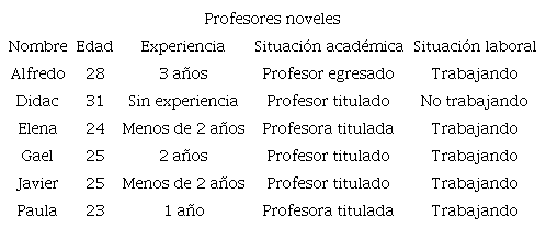 Dentro de los criterios de selección se consideró la experiencia en aula, la cual debía ser de un año hasta un máximo de tres y titulación o egreso de la carrera de Pedagogía en Castellano. Con el fin de preservar la privacidad y la confidencialidad, se utilizaron pseudónimos para nombrar a los participantes (tabla 1). Del mismo modo, los participantes accedieron al estudio por medio del consentimiento informado. Las entrevistas fueron realizadas el año 2017 en Santiago de Chile, y después fueron grabadas y transcritas para la investigación.