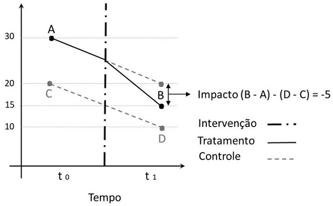 Como mostra a Figura 1 , o impacto é detectado pelo cálculo de uma dupla diferença nas variáveis de resultado: aquela entre o período posterior e anterior à implementação do programa; e aquela entre tratamento e controle. Com dados desagregados o estimador de DD pode ser obtido por meio de uma equação de regressão linear, que tem a vantagem de permitir a inclusão de variáveis de controle e fornecer facilmente o erro padrão da estimativa: