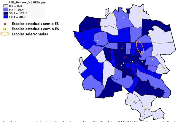 A avaliação de impacto foi realizada em uma escola da zona leste de Londrina localizada em uma vizinhança com indicadores de crimes patrimoniais elevados e cuja permissão para a realização da pesquisa nos foi dada (escola tratamento). Essa escola inicialmente recebeu dois policiais militares da reserva em 13 de maio de 2019, um para atuar no período entre 7 e 15 horas e outro para atuar no período entre 15 e 23 horas. Ela foi comparada com outra escola com localização e características similares, mas que não recebeu o programa (escola controle). A Figura 2 mostra o mapa de bairros de Londrina com as taxas bayesianas de crimes patrimoniais (ocorrências por 10 mil habitantes) para o ano de 2017 e as escolas da rede estadual que receberam (pontos em amarelo) e não receberam (x em vermelho) o programa até dezembro de 20194 . As escolas selecionadas para o estudo estão circuladas no mapa.