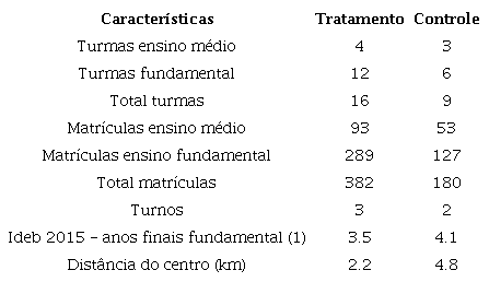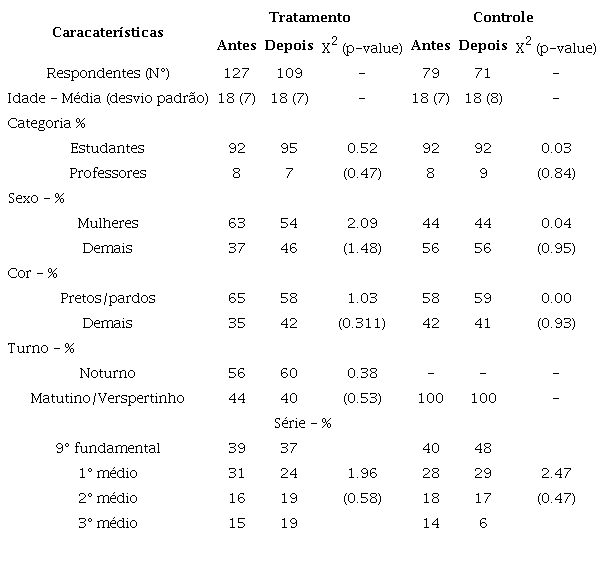 Uma comparação entre as escolas selecionadas pode ser vista na Tabela 1 , que indica que a escola tratamento é maior em termos de turmas e matrículas, tem Índice de Desenvolvimento da Educação Básica (Ideb) menor e funciona nos três turnos, ao passo que a escola controle é menor, tem Ideb maior e funciona apenas nos turnos matutino e vespertino. Essas diferenças se devem em grande medida aos próprios critérios usados na escolha das escolas de Londrina que inicialmente receberam o programa Escola Segura. Apesar dessas diferenças, os dados coletados pela pesquisa ( Tabela 2 ) sugerem que as escolas tratamento e controle possuem públicos com perfis similares, exceto em relação à categoria sexo (mais mulheres nas escolas tratamento). As diferenças entre as escolas tratamento e controle em relação ao turno e ao sexo serão controladas nos modelos de regressão. A Tabela 2 também indica que os públicos de ambas as escolas não sofreram alterações no período posterior à implementação do programa. As entrevistas semiestruturadas com a diretora e os policiais que atuavam na escola tratamento e as conversas com a pedagoga da escola controle também não indicaram nenhuma mudança potencialmente capaz de afetar as variáveis sob estudo. Em conjunto, essas informações indicam que os casos selecionados são balanceados e que o desenho de pesquisa parece atender bem às suposições do método de DD5 .