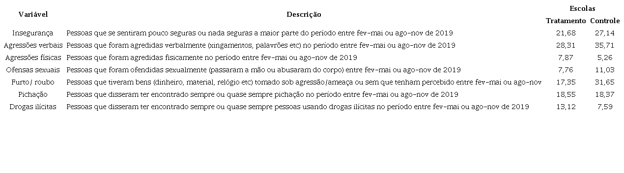 A Tabela 3 mostra as variáveis de resultado usadas nas análises. Como é possível notar, os pesquisados que se sentiam pouco ou nada seguros eram minoria em ambas as escolas – 22 por cento no tratamento e 27 por cento no controle. Seguindo tendência já identificada em outros trabalhos (NESELLO et al ., 2014), o tipo de violência mais comum nas escolas são as agressões verbais, muitas vezes tratadas pela literatura como violência psicológica ou bullying. Esse problema era mais prevalente na escola controle (35 por cento) do que na escola tratamento (28 por cento). A escola controle também tinha maior prevalência de casos de furto/roubo e ofensas sexuais. Para as demais violências reportadas, a prevalência era semelhante ou um pouco maior na escola tratamento do que na escola controle.