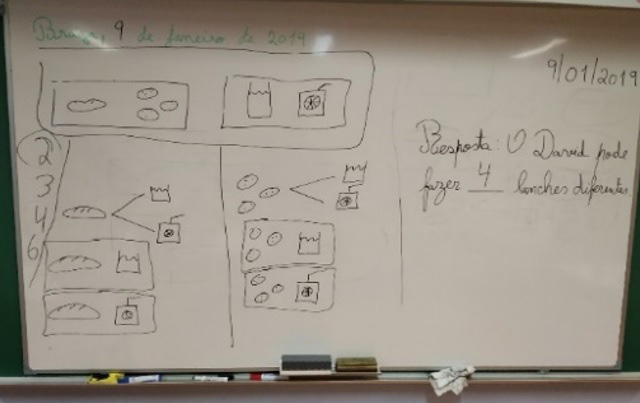 Por fim, houve uma pequena discussão no âmbito da formulação de problemas, no sentido de formular uma situação diferente, recontextualizando o problema inicial. Os alunos sugeriram que se poderia modificar o contexto do problema, utilizando alimentos para o lanche, retomando a sua experiência da primeira tarefa.