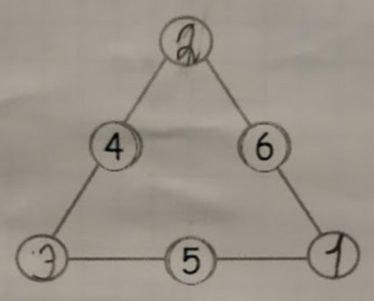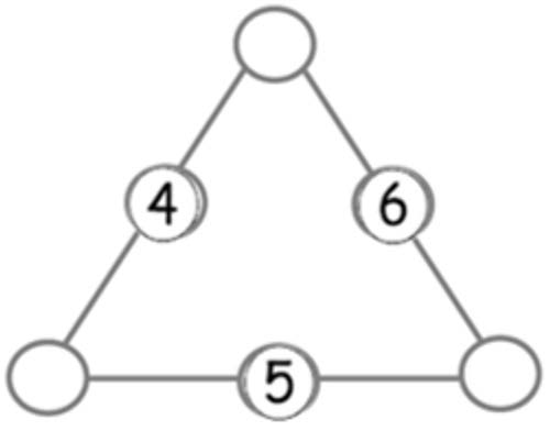 A sexta tarefa consistiu no desenvolvimento de um problema de processo, em trabalho de grupo. A tarefa apresenta um problema relacionado com um triângulo mágico ( Figura 11), na qual os alunos foram desafiados a completar um esquema de um triângulo, introduzindo valores nos espaços delineados (vértices do triângulo e pontos médios), de forma que o resultado da adição dos três valores, de cada lado do triângulo, correspondesse a um resultado comum. Numa primeira fase, os triângulos já se encontravam com os valores dos pontos médios escritos, pelo que os alunos tiveram de o completar com os números que satisfaziam a condição do problema.